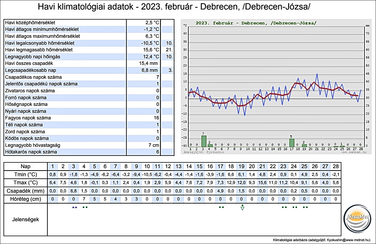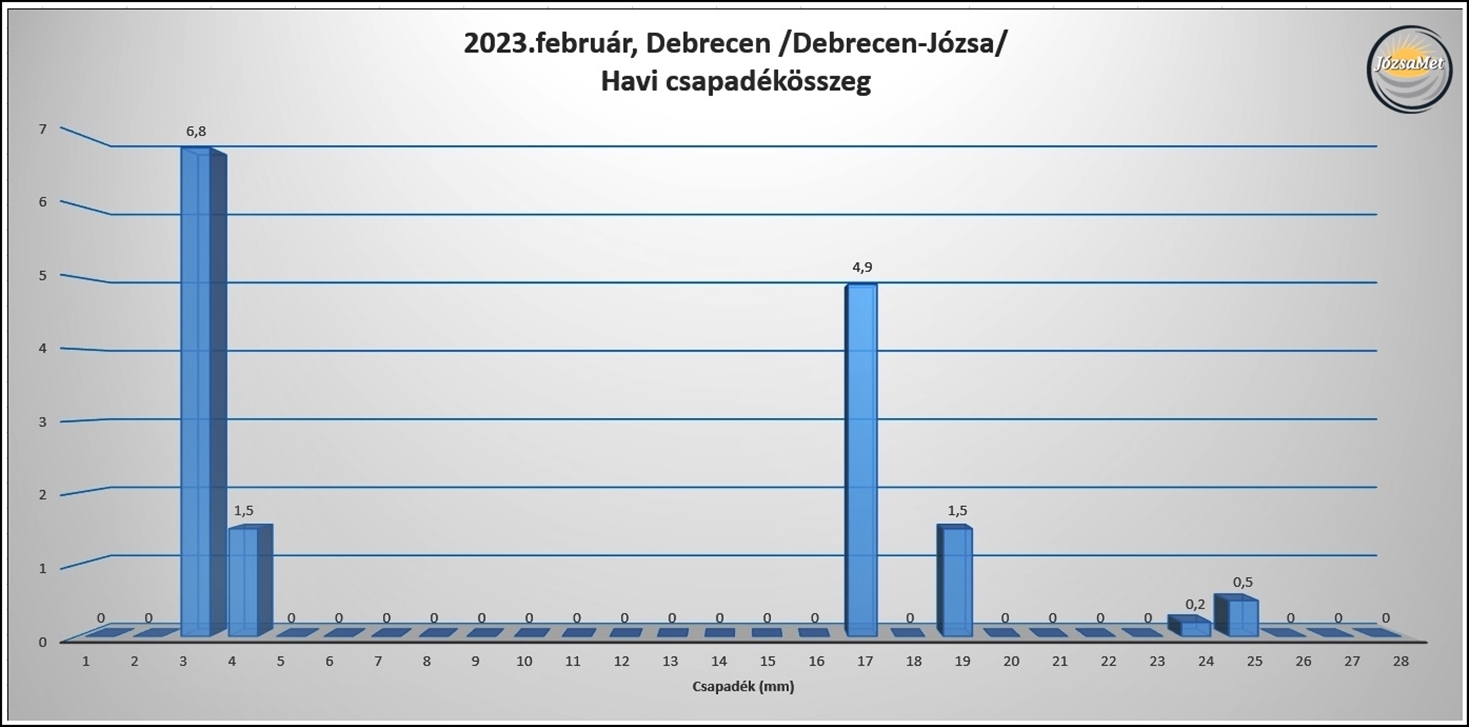 Mind a három téli hónapunk (december, január, február) középhőmérséklete magasabb volt a sokéves átlagnál.Tehát a 2022/2023-as tél, hőmérséklet tekintetében pozitív anomáliával zárt.